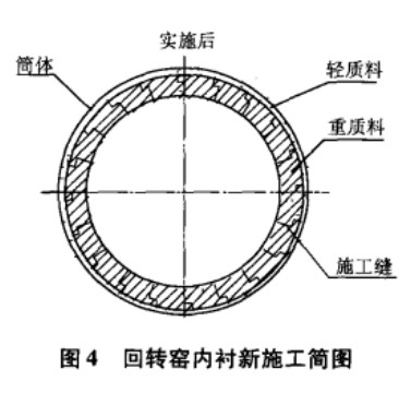 經(jīng)過與原料廠家、大修部門對該問題的共同探討,較確定將原有兩條澆注料之間的直縫施工修改為有錯臺的施工縫,阻擋在高溫條件下高溫炭粉由施工縫進入輕質料層;剞D窯內襯新施工簡圖見圖4。此項措施較明顯地改善了內襯的使用狀況,次采用就使回轉窯內襯的使用壽命提高到了440天以上。